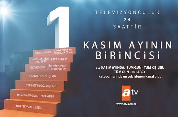 Kantar Medya'dan alınan verilere göre, Kasım ayında da yüksek izlenme oranlarına sahip olan atv birinciliğini bırakmadı. Kaliteden ödün vermeden zirvede kalan atv, en çok izlenen kanal olma unvanını taşımaya devam ediyor. atv'yi, ilgiyle takip edilen, sabah kuşağının reyting rekorları kıran ve milyonları ekrana kilitleyen programı Müge Anlı ile Tatlı Sert, 10 sezondur ekranda yer alan Esra Erol'da, gündemin nabzını tutan haber programları atv Ana Haber Bülteni, atv Gün Ortası, Kahvaltı Haberleri, atv'de Hafta Sonu, Son Durak dünyanın en çok kazandıran ve izlenen bilgi yarışması Kim Milyoner Olmak İster, samimi ve hoş sohbetiyle izleyenlerin gönlünü fetheden Prof. Dr. Nihat Hatipoğlu'nun programları, atv ekranının sevilen, çok izlenilen dizi ve programları ile ilgili pek çok çok detay ile özel ana ulaşabileceğiniz Dizi TV, izleyicinin beğeniyle takip ettiği dizilerden, yetimhanede ailesiz büyüyerek hayata tutunmaya çalışan 5 genç kızın hayat hikâyesi Kırgın Çiçekler, yeraltı dünyasının tepesine doğru tırmanmakta olan Hızır Çakırbeyli ve ailesinin efsane bir oyuncu kadrosuyla ekrana aktarılan hikâyesi Eşkıya Dünyaya Hükümdar Olmaz, hayata tutunabilmek için amansızca mücadele eden dört kardeş ve çocukları için her türlü fedakârlığa katlanan genç ve güzel bir annenin iç içe geçen öyküsünün anlatıldığı Kanatsız Kuşlar, gençliği cezaevinde geçmiş, sevmeyi öğrenmeye fırsatı olmamış Ali ve hiç kimseyi sevmeyen Mavi'nin hikâyesi Aşk ve Mavi, bir kadının, bir annenin sırlarla dolu geçmişi; hiç kopmayan kördüğüm haline gelen bağların, gerçek aşkın hikâyesi olan Cennetin Gözyaşları, hiçbir şeyin benzeri kendisi değildir sloganıyla yola çıkan ve mezarcı Bahtiyar'ın istemeden silah kaçakçısı Rıfat Çakar'ın yerine geçmek zorunda kaldığında başına gelen tirajikomik olayları eğlenceli bir dille anlatan atv'nin yeni dizisi Bahtiyar Ölmez ve Safranbolu'dan İstanbul'a uzanan bir aşk hikâyesi olan Seven Ne Yapmaz birinciliğe taşıdı.