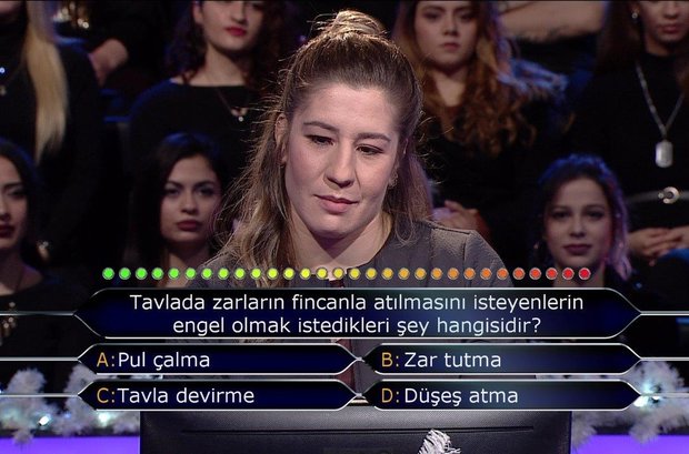 'Kim Milyoner Olmak İster Yılbaşı Özel'de Yasemin Adar'a sorulan 2'nci soru ve cevabı a) Pul çalma b) Zar tutma c) Tavla devirme d) Düşeş atma Cevap: B - Zar tutma