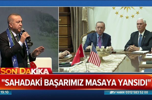 YPG/PKK'nın güvenli bölgeden çekilmesi için verilen 120 saati hatırlatan Erdoğan: "Buna uyulduğu takdirde ne ala, uyulmadığı takdirde 120 saat bittiği anda tekrar harekatı aynen bırakılan yerden devam ettiririz. Sadece 9 gün içinde bir kısmı üst düzey 765 teröristi etkisiz hale getirerek bin 500 kilometrekarelik alanı örgütün zulmünden kurtardık. Güvenlik bölgesini koruma altına alacağız. Dersimizi çalıştık, planlarımız, projelerimiz tamam. Adımlarımızı buna göre atıyoruz. Terör örgütüyle anlaşmadık, ABD ile anlaştık. Burada birileri saptırma yapıyor, öyle bir şey yok." ifadelerini kullandı. Erdoğan, Amerikalı müttefiklerimizden beklentimiz Türkiye'ye verdikleri sözlere bu sefer bağlı kalmalarıdır, dedi.