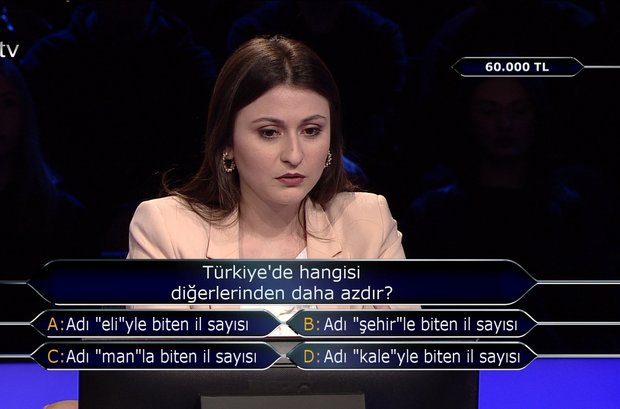 Türkiye'de hangisi diğerlerinden daha azdır? A: Adı 'eli'yle biten il sayısı B: Adı 'şehir'le biten il sayısı C: Adı 'man'la biten il sayısı D: Adı 'kale'yle biten il sayısı Doğru cevap) D: Adı 'kale'yle biten il sayısı