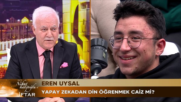 İlk soru Eren Uysal isimli izleyiciden geldi. İstanbul Teknik Üniversitesi'nde okuyan ve programa arkadaşlarıyla katılan Eren "Yapay zekadan din öğrenmek caiz midir?" diye sordu. Hatipoğlu, "Yapay zeka, internet vb. şeyler iyi amaçlarla kullanılırsa elbette caiz değildir. Yapay zekadan da dinle ilgili merak ettiklerini öğrenebilirler. Orayı bir ansiklopedi olarak düşünün. Siz ne verirseniz yapa zeka onu yapacaktır. Yapay zeka dediğimiz sonuç olarak yapay olmayan insanların elinde. Örneğin bir dönem klonlama konusu vardı. Biz orada caiz değildir dedik ama tek bir şartla o da insanlığa zarar veren eylemlere yol açmayacaksa. Burada da yapay zeka, internet sosyal medya nasıl kullanıldığı noktasında değerlendirilmelidir. Bir bıçak elma kesersen zarar vermez ama bu bıçakla cinayet işlemeye kalkarsan masum olanı kötü yolda kullanmış olursun. Önemli olan kişilerin doğru işle meşgul olması, tuzaklara düşmemesidir." Diyerek yanıt verdi.