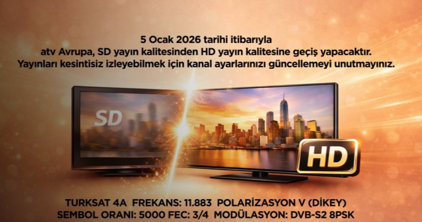 5 Ocak 2026 tarihi itibarıyla atv Avrupa, SD yayın kalitesinden HD yayın kalitesine geçiş yapacaktır. Bu geçişle birlikte izleyiciler, atv Avrupa yayınlarını daha net, daha canlı ve yüksek çözünürlükte izleme imkânına kavuşacaktır.
