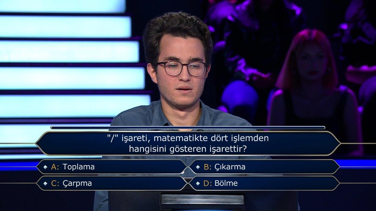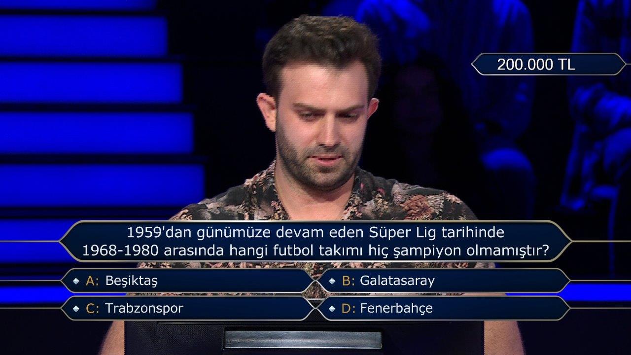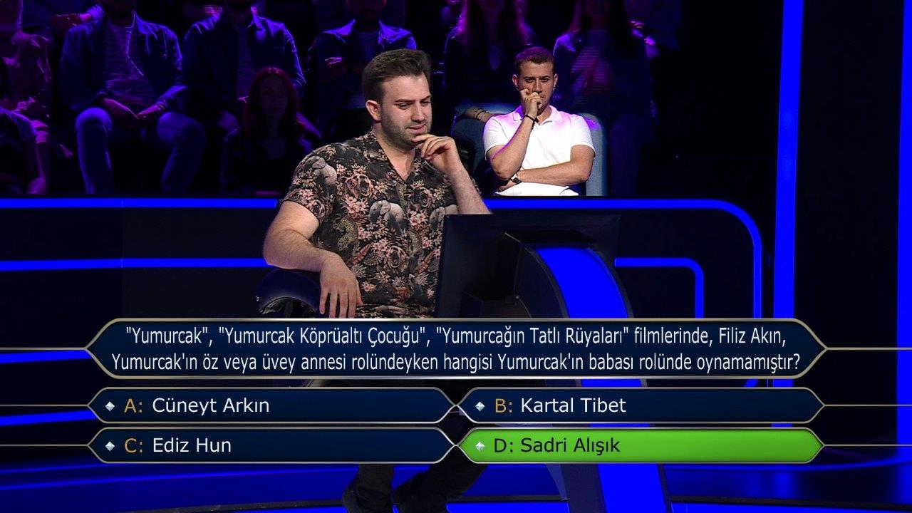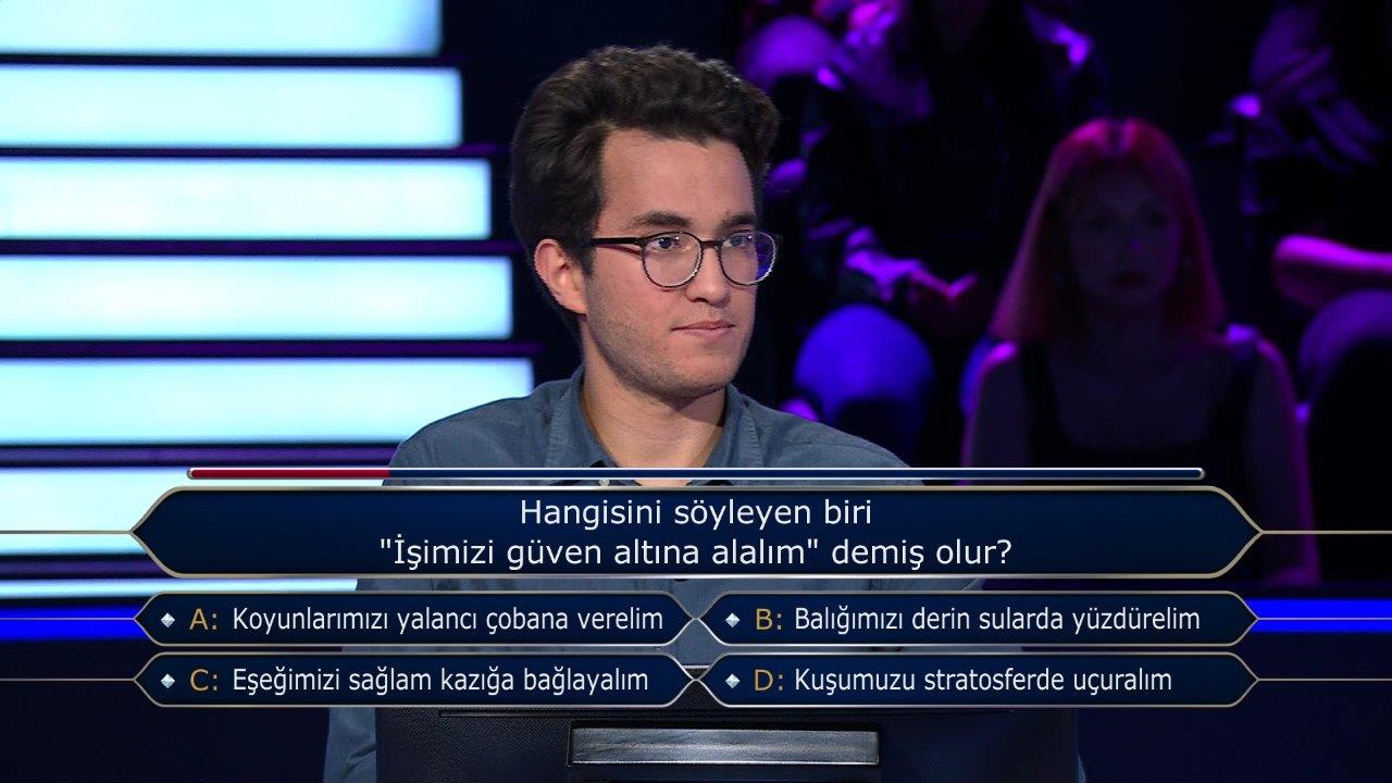 27 Temmuz Perşembe günü yayınlanan 'Kim Milyoner Olmak İster?' yarışmasında sorulan bir soru sosyal medyayı salladı. Futbolla ilgili olan soru, taraftarlar tarafından uzun süre sosyal medyada tartışma konusu oldu. İTÜ Endüstri Mühendisliği mezunu olan 28 yaşındaki Ahmet Zeki Ertem yarışmaya rahat başladı. Doğru yanıt: d şıkkı 'Sağanak yağışlı' Market ve pazar tezgahlarında satılan hangi adda bir sebze vardır? Doğru yanıt: c şıkkı 'Taze fazulye' Şehir içi toplu ulaşım araçlarında kullanılan kartlardaki aylık abonelik durumunu anlatmak için kullanılan kelime hangisidir? Doğru yanıt: d şıkkı 'Abonman' 100, 200, 300, 400 ve 500 sayılarının ortalaması kaçtır? Doğru cevap: c şıkkı '300' ABD'li yazar Louisa May Alcott'un 1868'de ve 1869'da yayımlanan, dört kız kardeşin hayatını konu alan romanı hangisidir? Doğru cevap: a şıkkı 'Küçük Kadınlar' Osmanlılar 'Adriyatik Denizi' için hangi adı da kullanmıştır? Doğru cevap: b şıkkı 'Venedik Körfezi' Hangi bilgi yanlıştır? Doğru cevap: d şıkkı 'Tüm hayvanlar omurgalıdır' ''Yumurcak'', ''Yumurcak Köprüaltı Çocuğu'',''Yumurcağın Tatlı Rüyaları'' filmlerinde, Filiz Akın Yumurcak'ın öz veya üvey annesi rolündeyken hangisi Yumurcak'ın babası rolünde oynamamıştır? Doğru cevap: d şıkkı 'Sadri Alışık' Ve işte o soru... Doğru cevap: a şıkkı 'Beşiktaş' Yarışmaya Ankara'dan katılan 23 yaşındaki Ali Bal da gününün başarılı yarışmacılarından biriydi. Bal'ın ilk sorusu şuydu; Doğru cevap: d şıkkı 'Bölme' Hangisini söyleyen biri 'İşimizi güven altına alalım' demiş olur? Doğru cevap: c şıkkı 'Eşeğimizi sağlam kazığa bağlayalım' 'İkametgah ilmühaberi' nedir? Doğru cevap: b şıkkı 'Yerleşim belgesi' 'Shakespeare'in eserlerini yazdığı dil' ve 'Albert Camus'nün eserlerini yazdığı dil' sırasıyla hangileridir? Doğru cevap: c şıkkı 'İngilizce ve Fransızca' Hangi halden hangi hale doğrudan geçen bir madde süblimleşmiş olur? Doğru cevap: d şıkkı 'Katıdan gaza' Hangisi Robert de Niro ve Al Pacino'nun birlikte rol aldığı bir film değildir? Doğru cevap: c şıkkı 'Taksi Şöförü' Hangisi bokstaki sıkletlerden birinin adı değildir? Doğru cevap: b şıkkı 'Sinek sıklet' Hangisi bir atasözüdür? Doğru cevap: b şıkkı 'Bir varmış bir yokmuş' ABD Dışişleri Bakanlığının yurt dışına çıkacak ABD vatandaşları için hazırladığı ''seyahat uyarıları''na göre, şu anda hangi şıktaki ülkelere gitmek diğer şıklardakilere gitmekten daha güvenilirdir? Doğru cevap: c şıkkı 'Romanya, Ruanda, Vietnam'