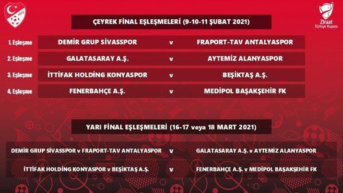 Ziraat Türkiye Kupası heyecanında çeyrek final ve yarı final eşleşmeleri belli oldu. Son 8 takım arasında seri başı olan Başakşehir, Beşiktaş, Fenerbahçe ve Galatasaray rakiplerini buldu. Çeyrek final maçları, 27-28-29 Şubat tarihlerinde oynanacak.